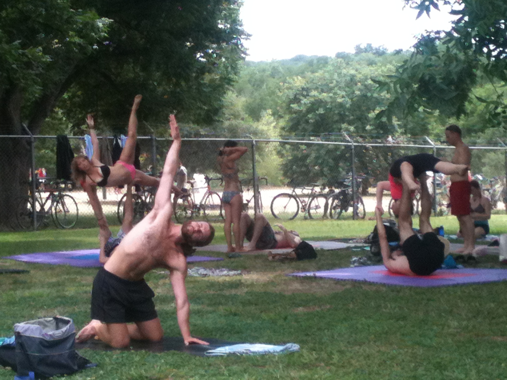 I always thought that yoga mat towels were a total gimmick. That was until I practiced yoga in Austin. Particularly in Christina Sell’s Asana Junkie practice at Bfree Yoga. Try practicing advanced asana for two hours in a pool of your own juices. It was umm…slippery. New poses that Christina and Shelby revealed included a prep for full bekhasana with leg-breaking pose (still looking for the Sanskrit on that one), and a fabulous noose wrap around the neck variation of EPRK. I also had the opportunity to work of chakrasana with Matt at Caste Hill Fitness remembering to put both feet down on the floor first.