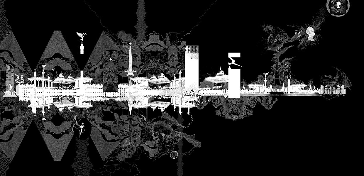 I was particularly taken by Shah’s works loosely inspired by earlier works of Le Corbusier. Deconstructing a photograph by flattening the image thus obscuring the hierarchy within the image and then running it through a auto-cad, photo-montage process created the experience of phantasmagoric architecture in staunch black and white.